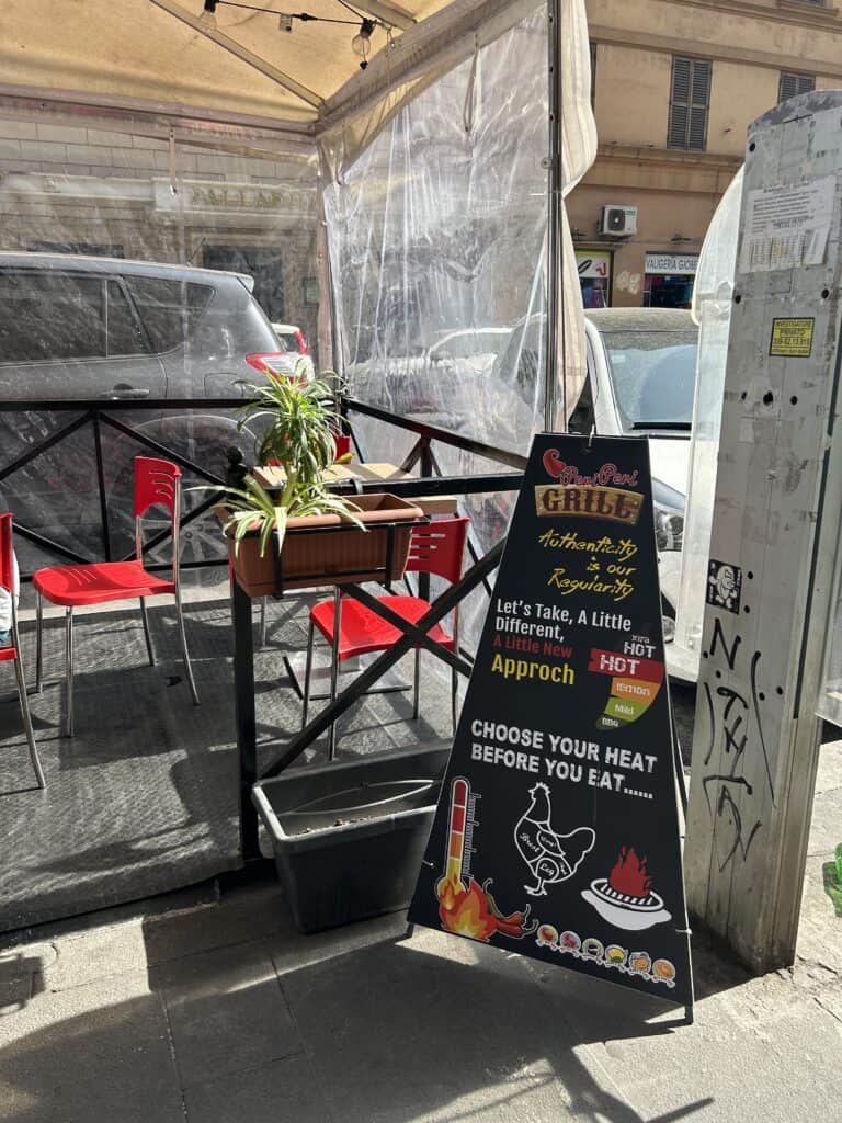 This restaurant offers a range of grilled chicken dishes with varying levels of spiciness. It very closely resembles Nandos. There is a decent indoor and outdoor seating space. The area is less bussier that Termini.